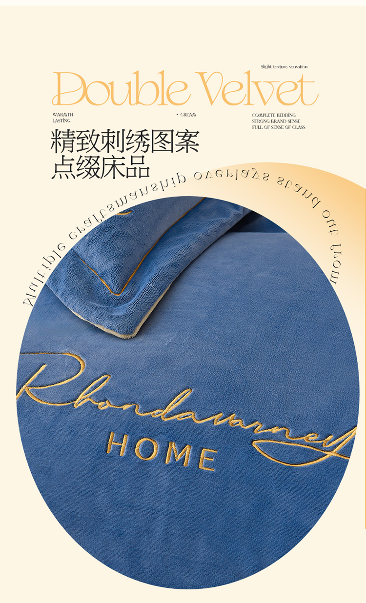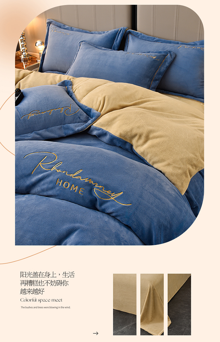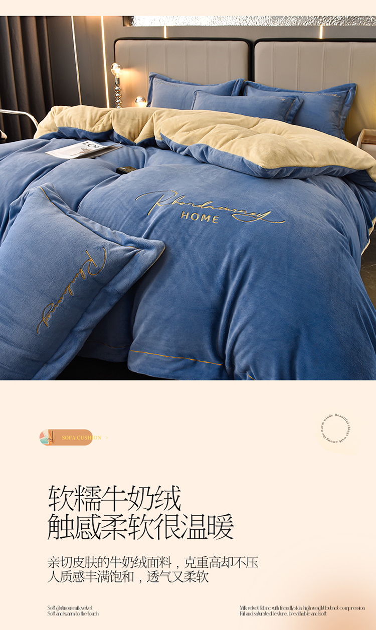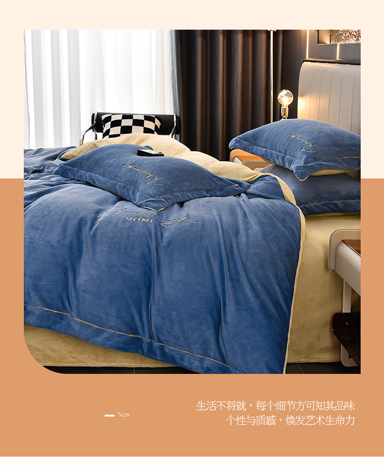 TAIHI(笙)牛奶绒刺绣四件套-爱丁堡系列-标准号-宾利蓝+奶茶