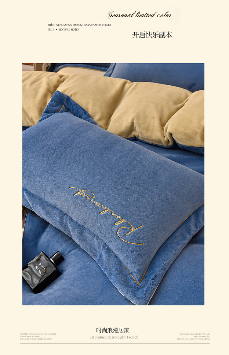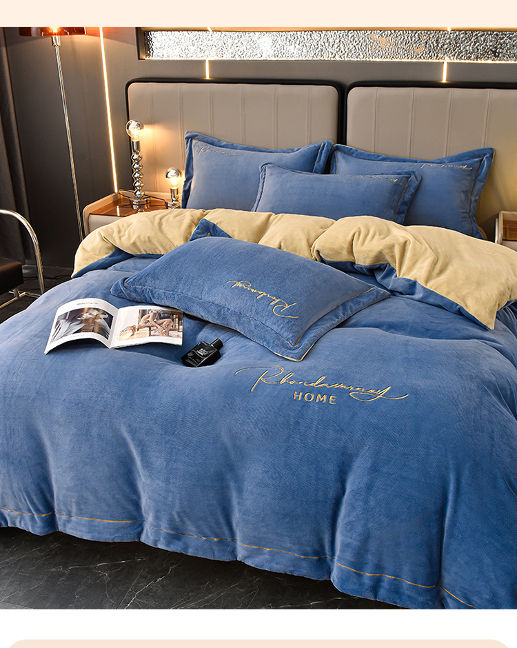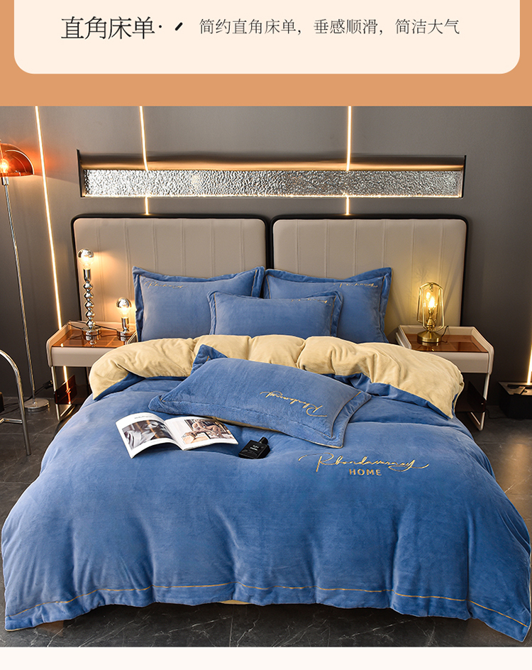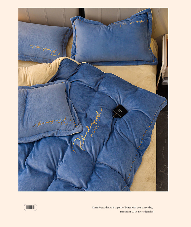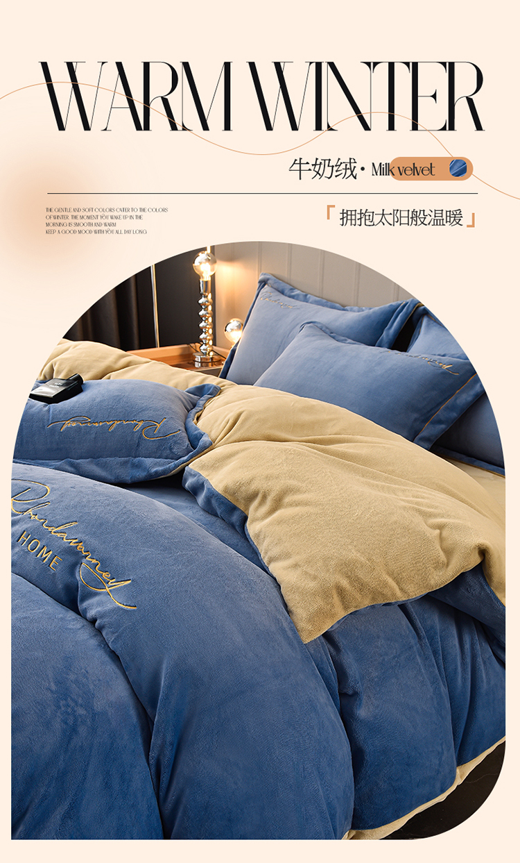 TAIHI(笙)牛奶绒刺绣四件套-爱丁堡系列-标准号-宾利蓝+奶茶